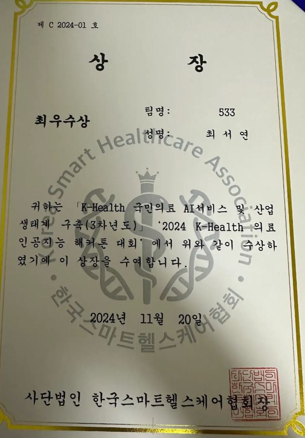 과학기술정보통신부와 정보통신산업진흥원이 주최하고, 한국스마트헬스케어협회가 주관한 「2024 K-Health 의료 인공지능 해커톤 대회」에서 전북대학교 533팀(팀장 : 컴퓨터공학부 최서연 학생, 팀원 : 컴퓨터공학부 김수민 학생 외 2명)이 최우수상을 수상하였다.