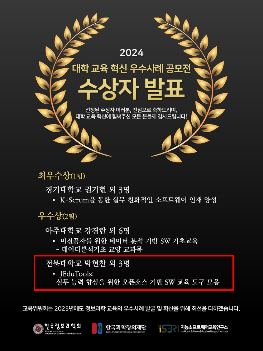 전북대학교 컴퓨터인공지능학부가 '2024 대학교육혁신 우수사례 공모전'에서 우수상을 수상하였다. 이 공모전은 한국정보과학회, 한국과학창의재단, 지능소프트웨어교육연구소가 공동 주최하고, 한국정보과학회 교육위원회가 주관하는 권위 있는 대회이다. 전국 대학의 혁신적 소프트웨어(SW) 교육 사례를 발굴하고 확산하기 위해 매년 개최되고 있다. 공모전에는 창의성과 실효성을 겸비한 다양한 사례들이 출품되며, 치열한 심사를 거쳐 선정된 우수 사례들은 대학 교육의 새로운 방향성을 제시한다.